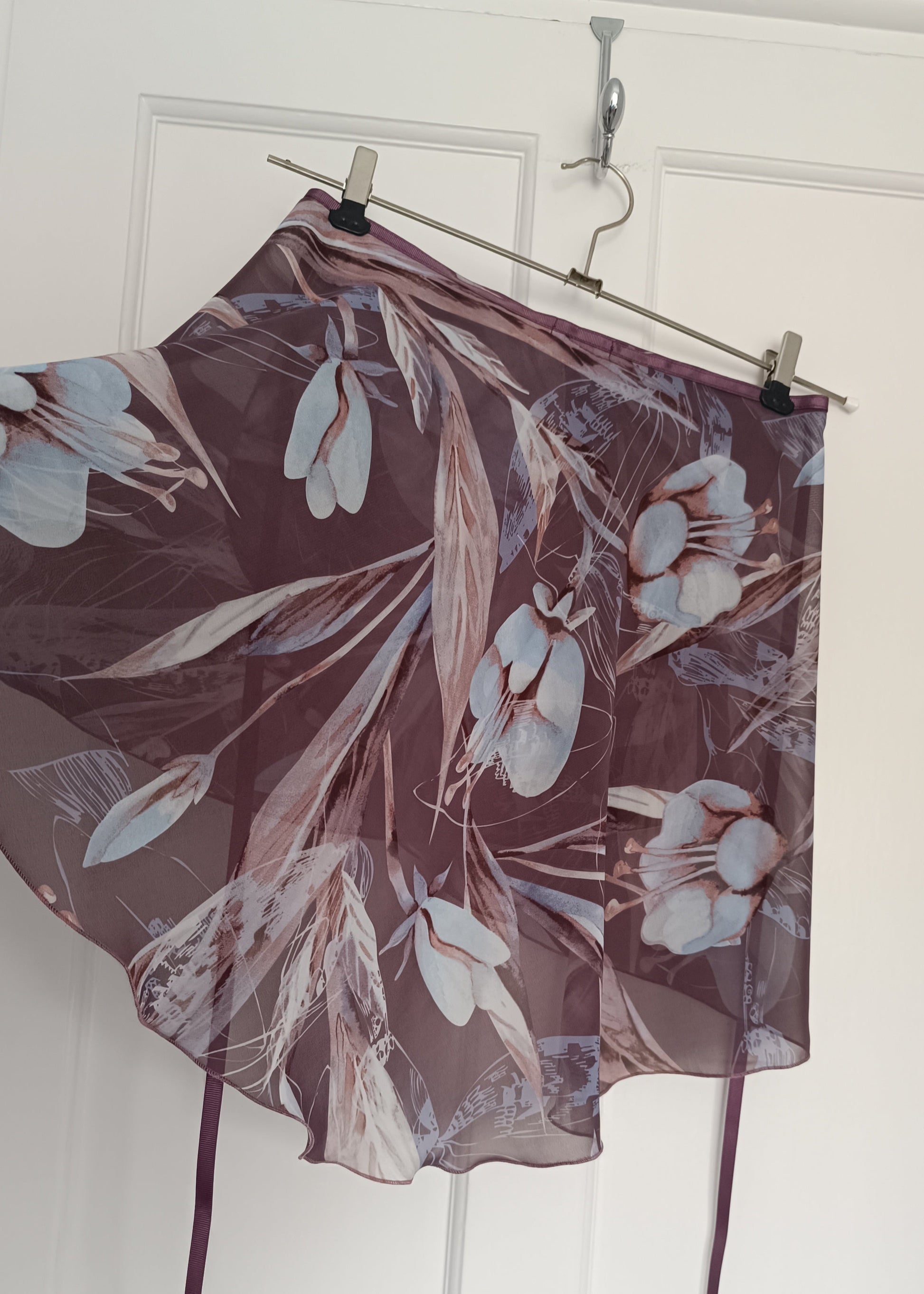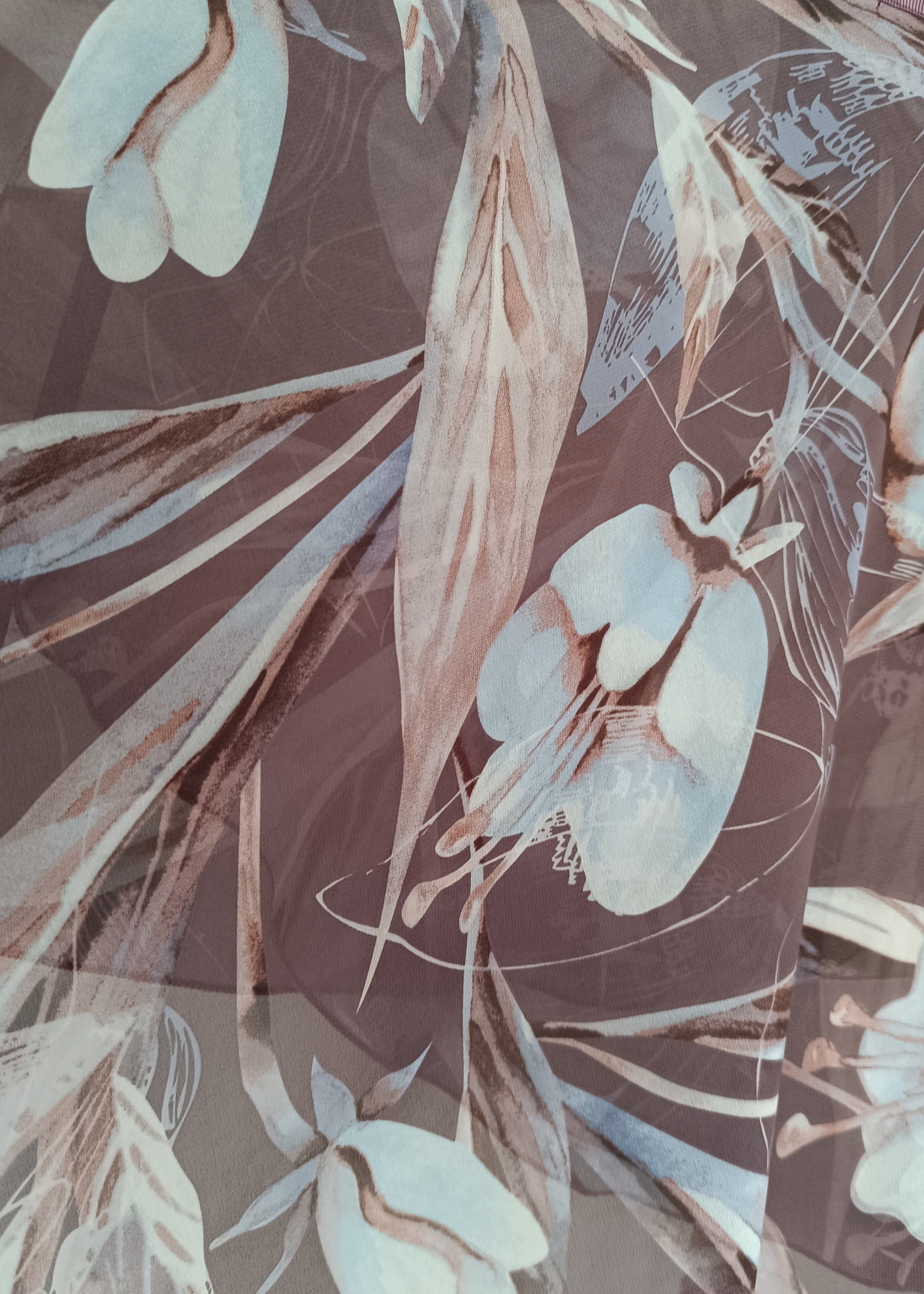Baby blue flower print on mauve brown backround. Material is light and flowy chiffon.