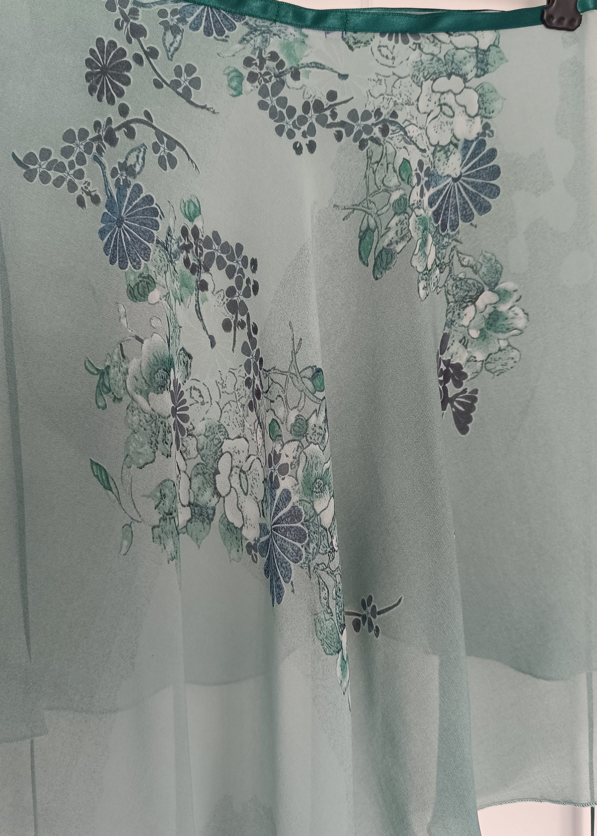 Rustic Medow is beautiful vinatge shade with uneven green coloring, has lighter and darker patches as part of fabric with floral print on the back. Material is light and flowy chiffon.