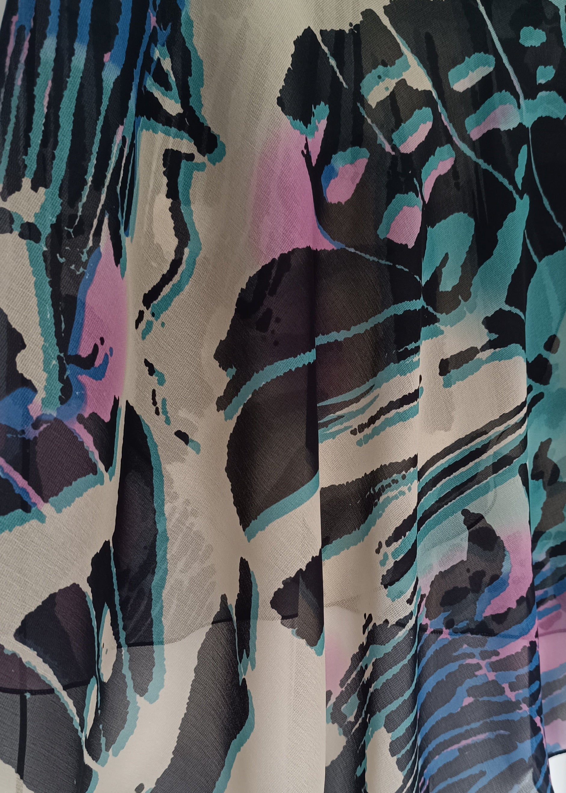 Abstract, yet slighlty resembling animal print including black, green, pink and beige colours. The layout of print is unique to each piece. Material is light and flowy chiffon.