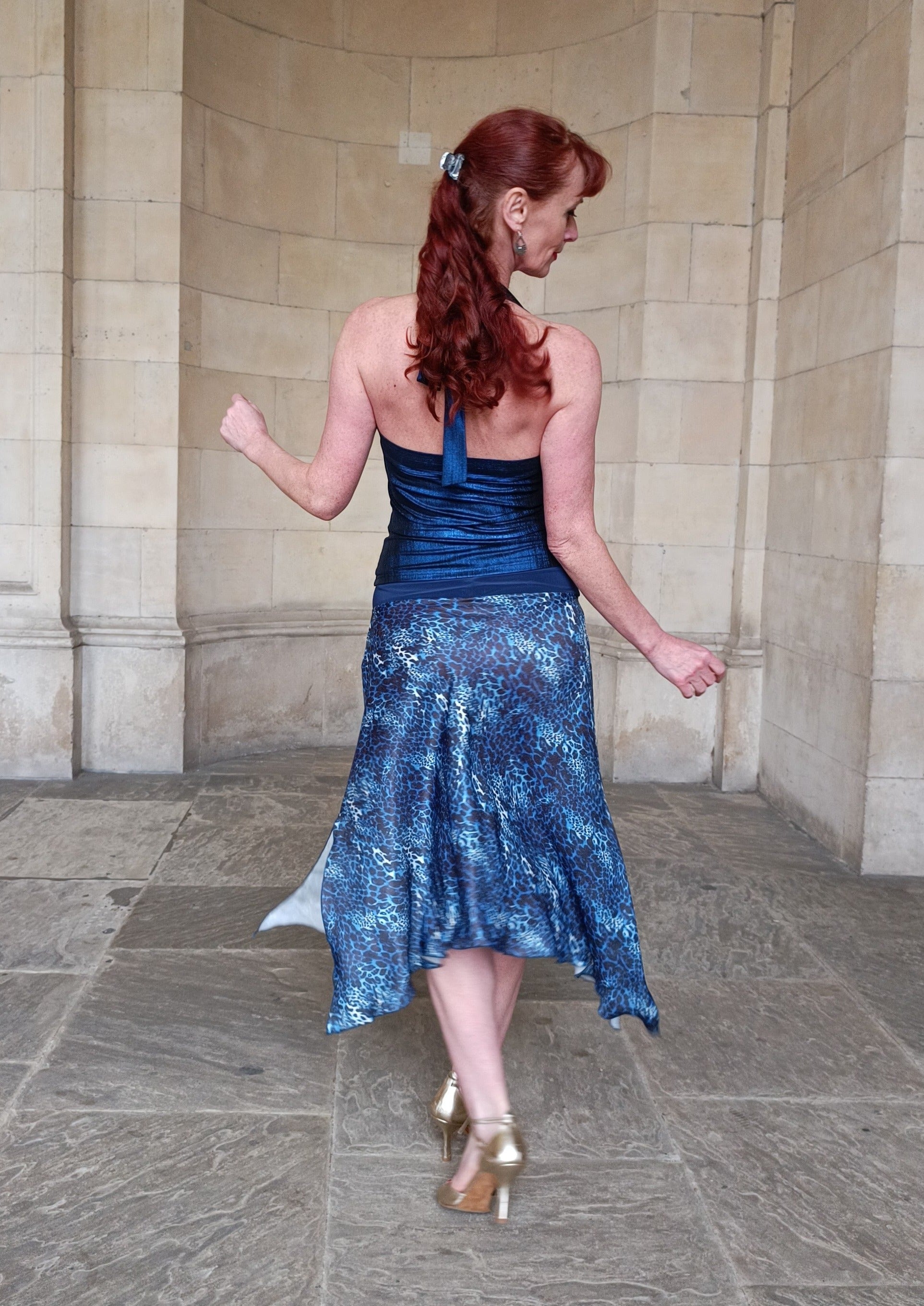 Main body of the skirt is made from soft flowy satin ( Non stretch). Wide waistband is from complimentary blue jersey.